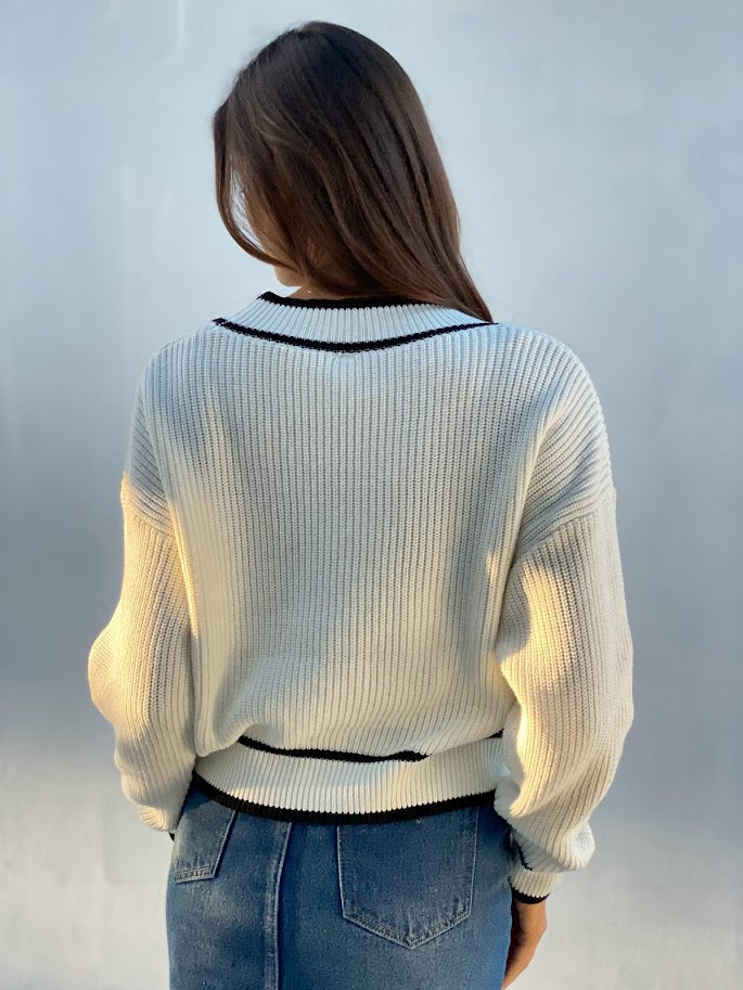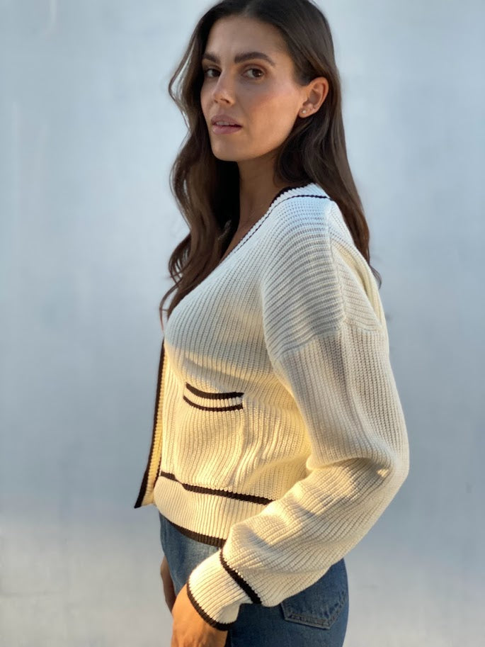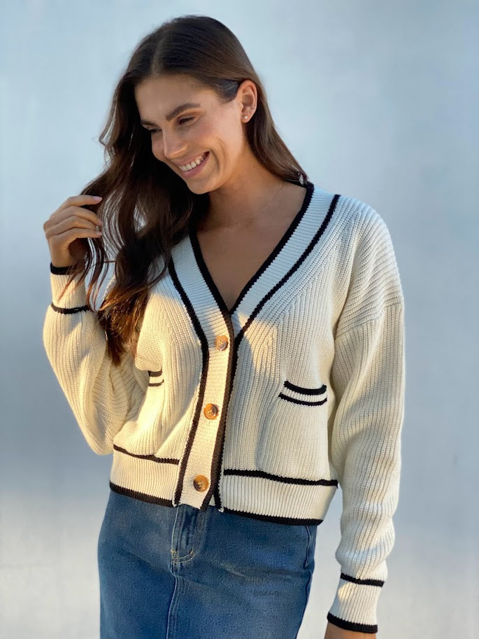 Bring all the winter vibes to your weekend look with this contrast knit cardigan. It's contrast knit material adds some cosy feels to your look as well as expresses your daring side. This knit cardi also features a contrast detail and a front pocket design which gives you that chic touch. Team with black boots, leather skirt and gold accessories for a vibe that won't go unnoticed.