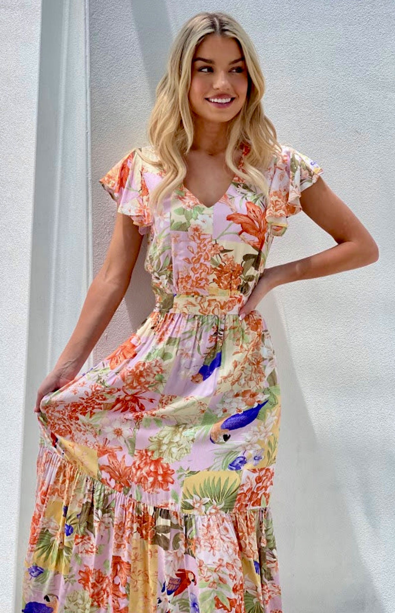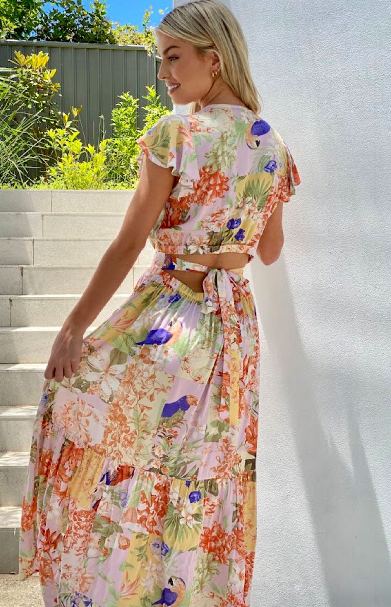 Make a bold statement in this floor sweeping maxi dress, perfect for any special occasions and events you've got planned. Featuring a floral patchwork print cotton material with a open back tie fastening and a ruffle sleeve design, what's not to love? If you're looking for a holiday dress then this floral dress is the one for you girl, it's giving us all the glam vibes for your next vacay. Just team it with some strappy heels for a seriously chic combo.