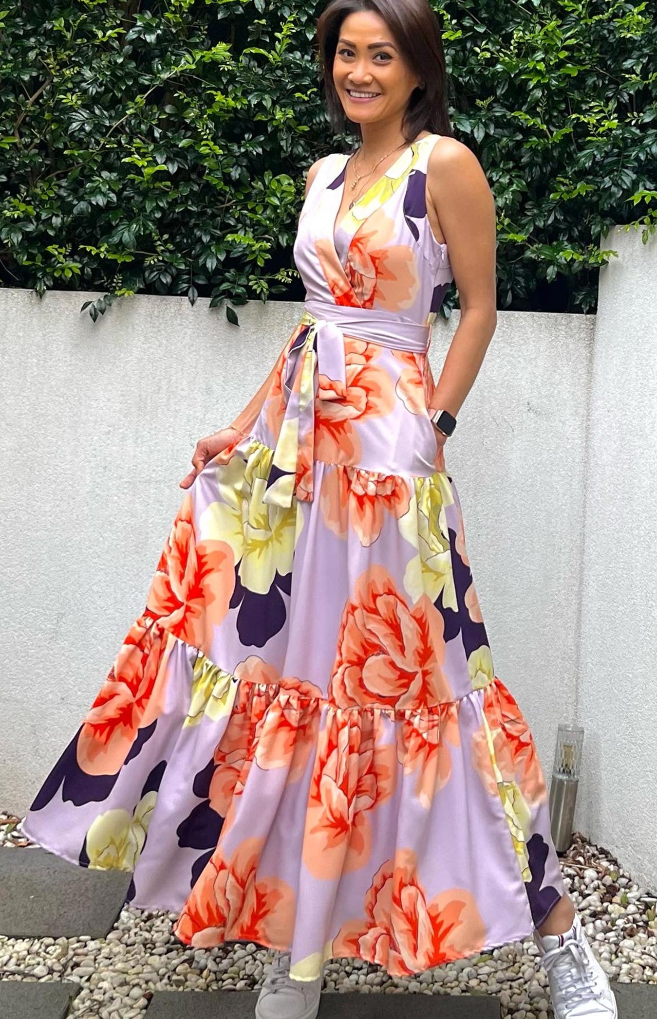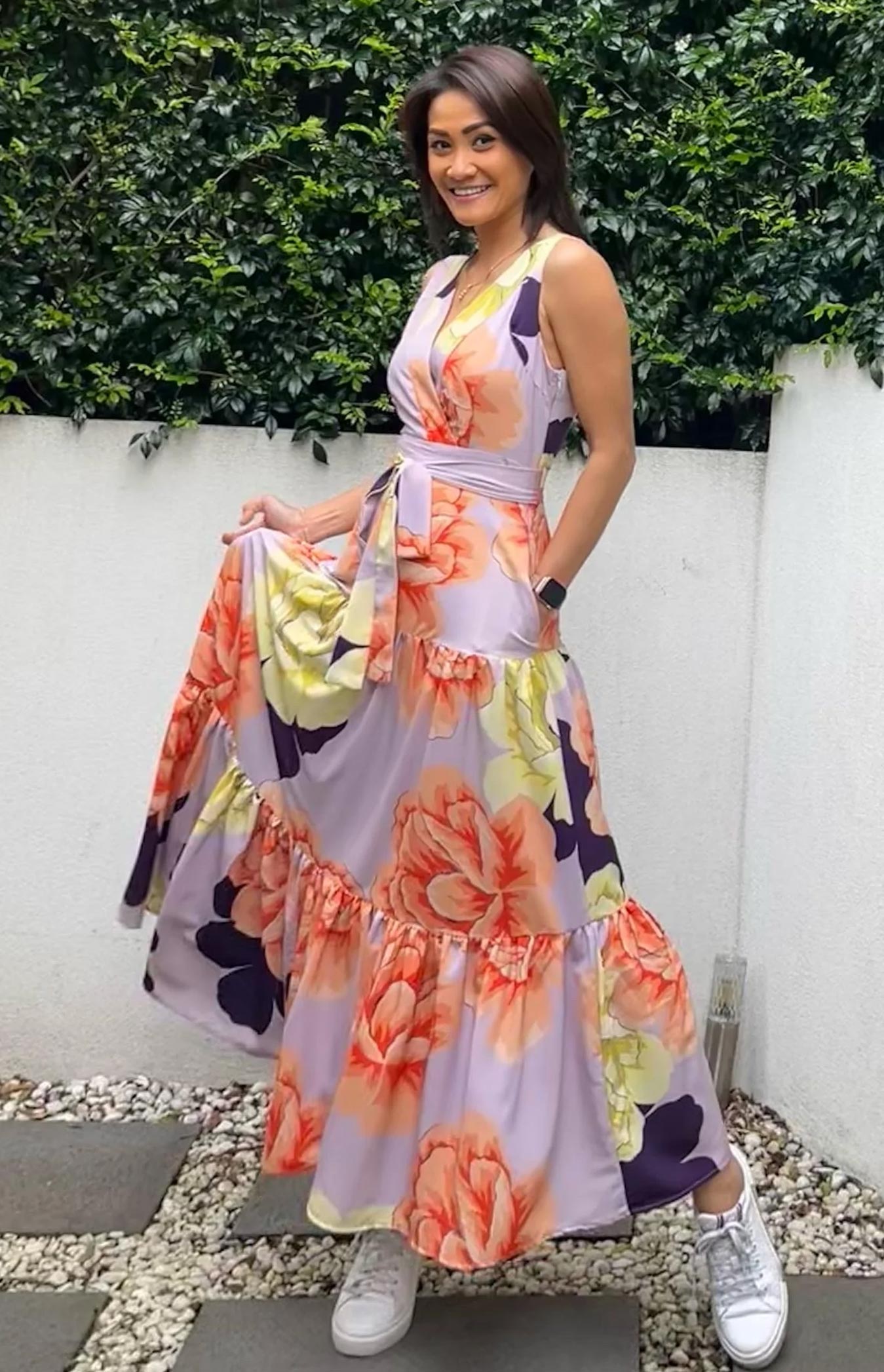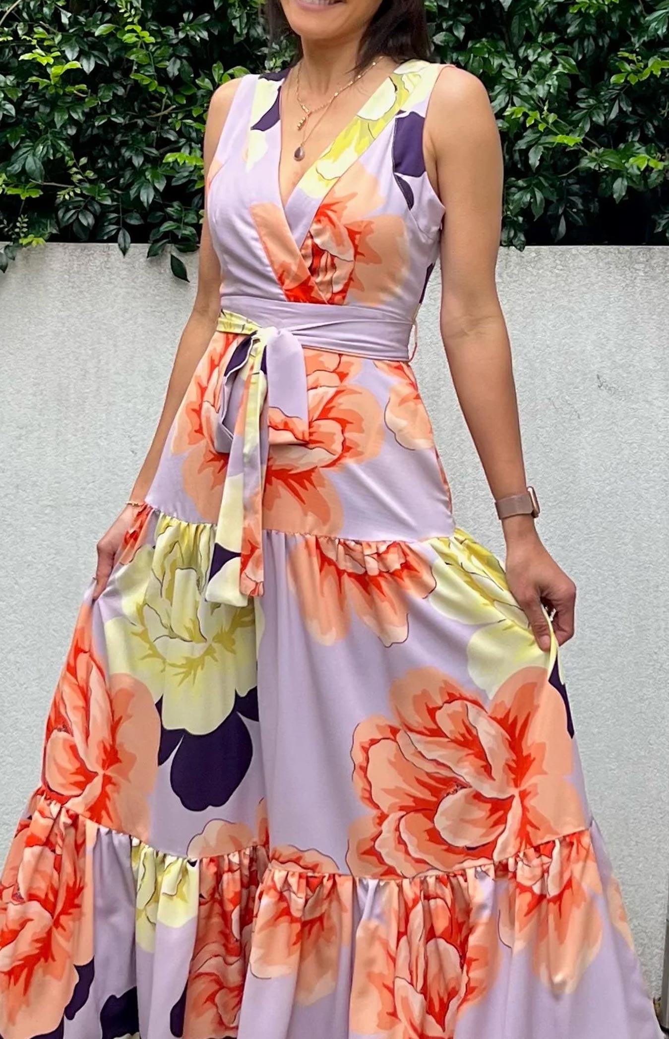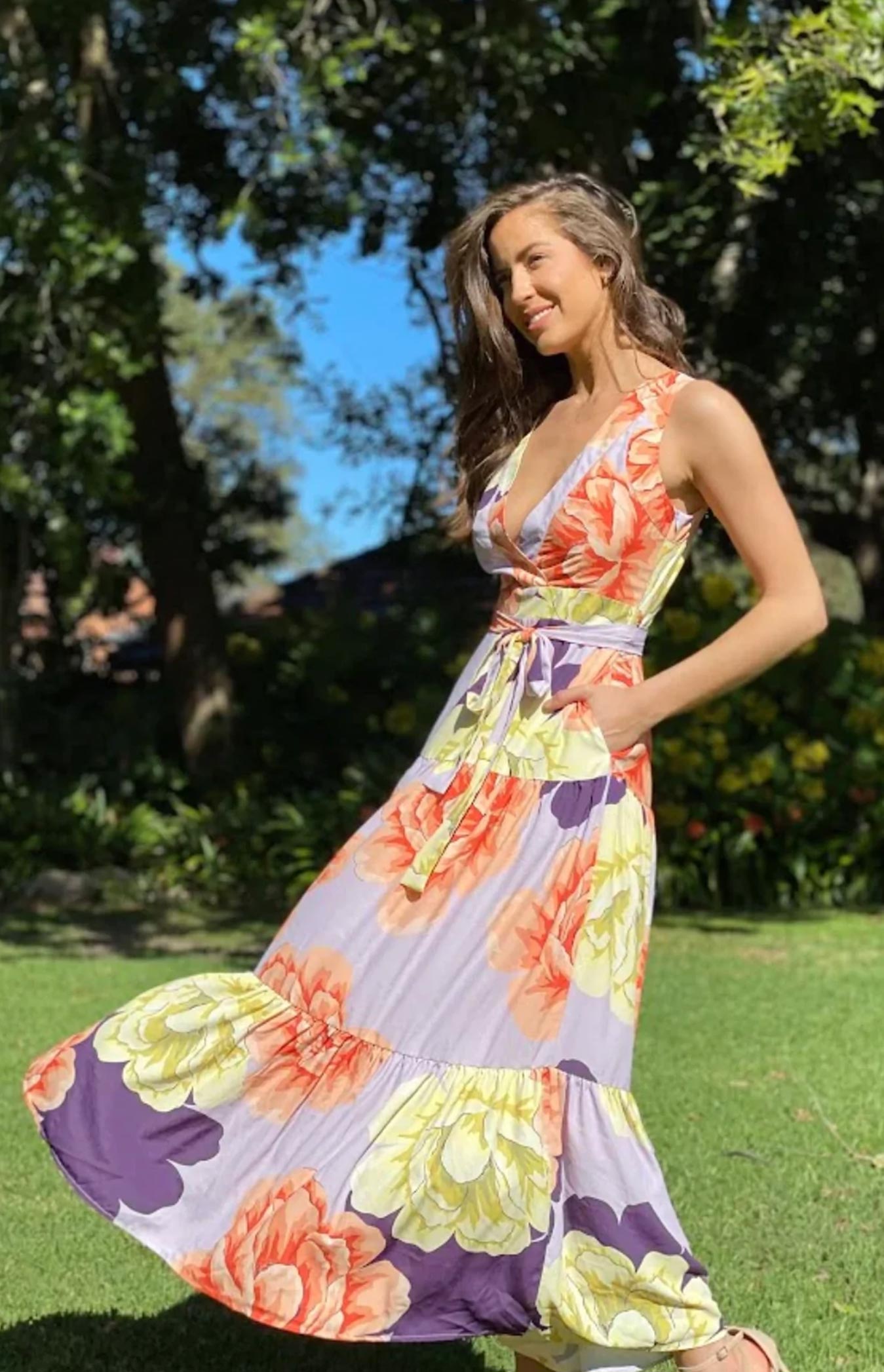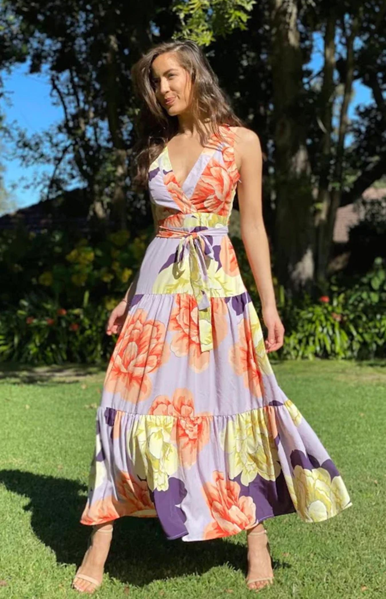 Adorned with bright flower print, this elegant shift dress is a playful choice for events. This Maxi length piece is designed in a regular fit with a feminine v neck cut. A flattering belted waist draws in your silhouette while tiered detailing gives a delicate finish.