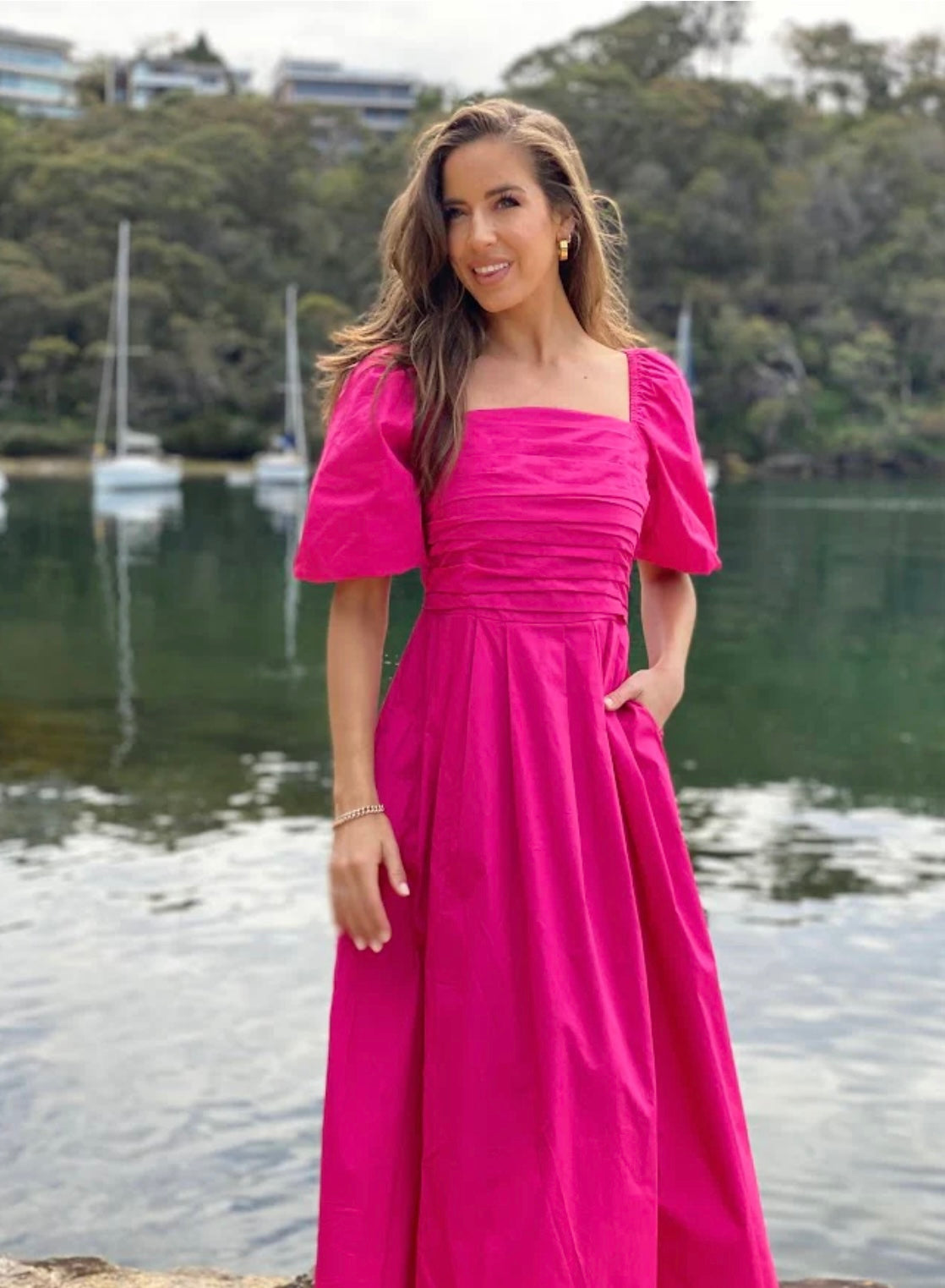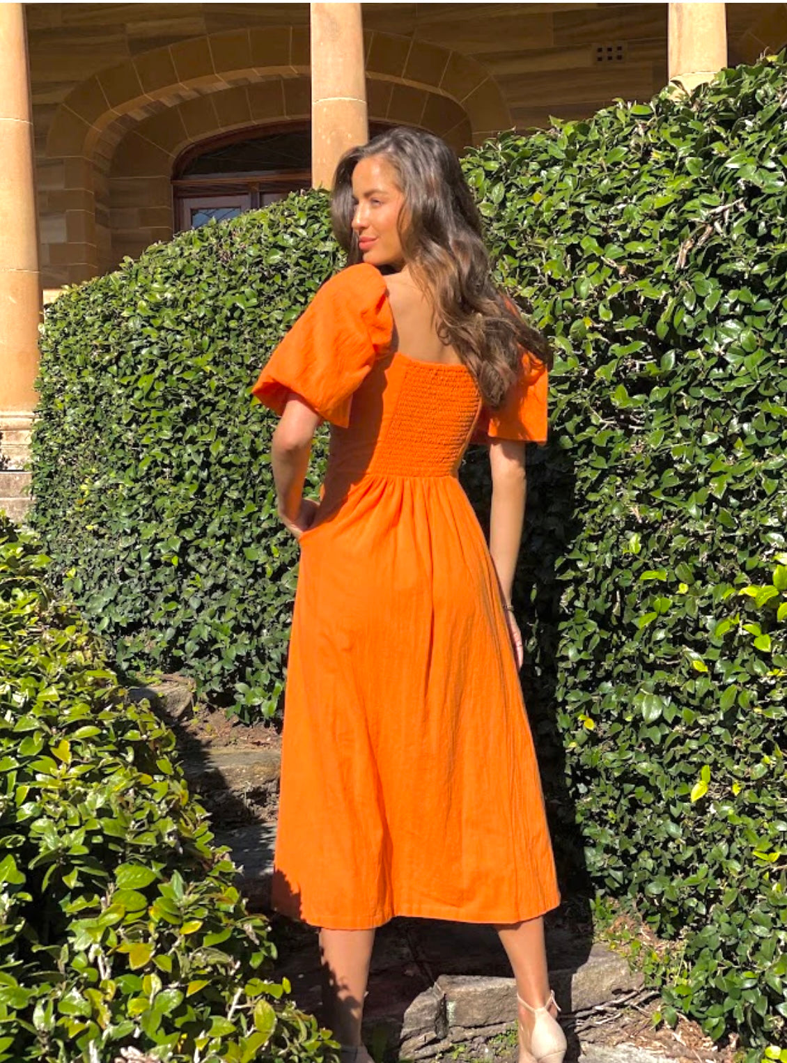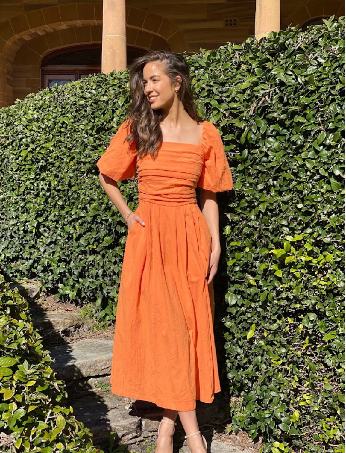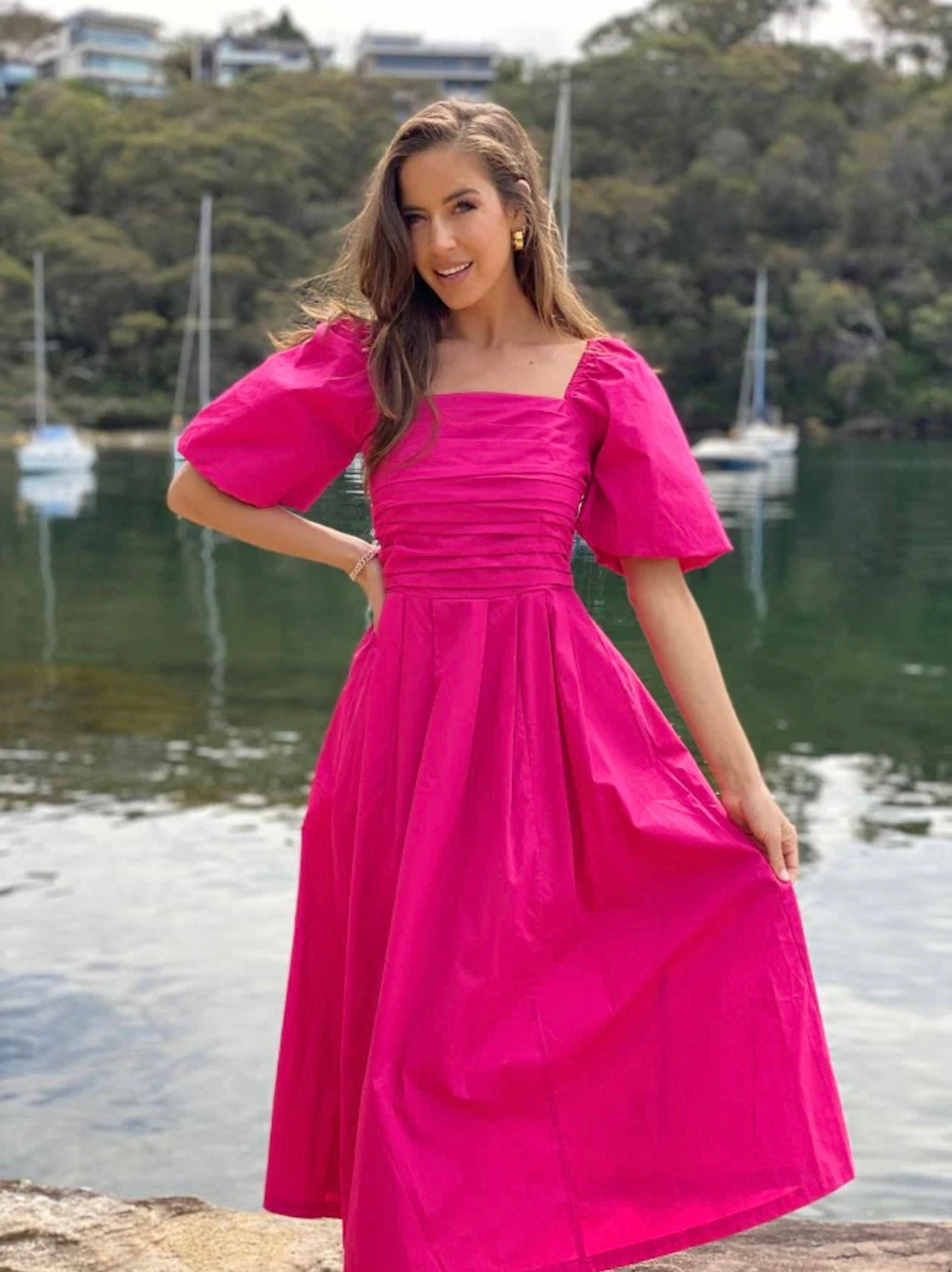 Breathable cotton-rich fabric give this midi dress an airy feel. It’s cut in regular fit, with a square neckline and shirred bodice for flattering shape. A tiered hem and 3/4 length puff sleeves add a touch of volume for a feminine finish.