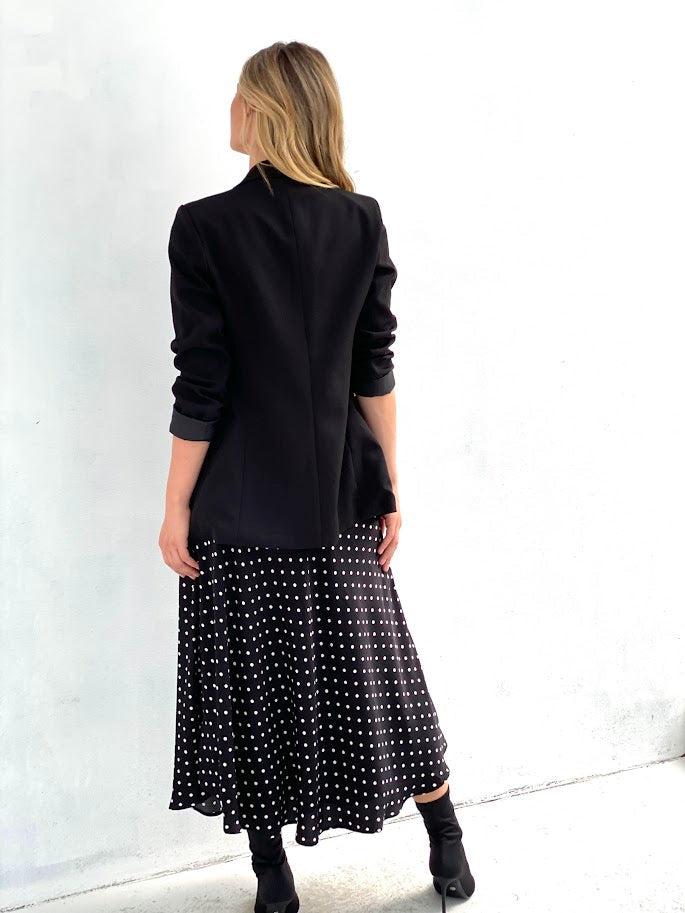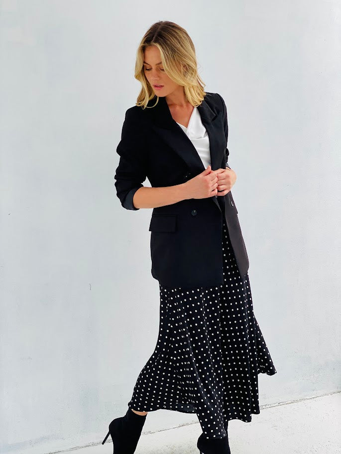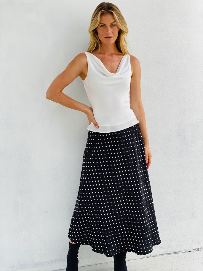 This satin polka dot a-line skirt is at the top of our new season wish list girl! Made from a black with white polka dots or green with black polka dots satin material, with an a-line design & mid length. This skirt can be styled seamlessly with a satin cami top or a long sleeve off-shoulder top.